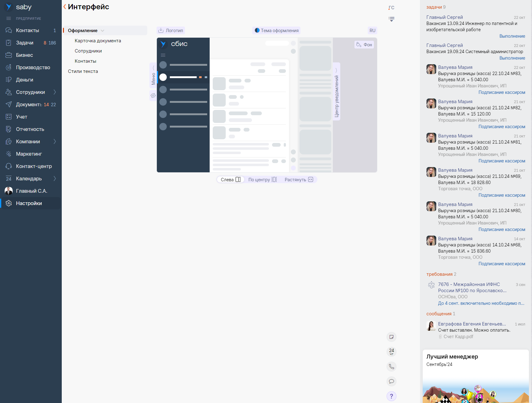 В СБИС можно настроить отображение элементов интерфейса: темную или светлую тему, размещение окон, панелей и инструментов. Перейдите в «Настройки» -> «Интерфейс» и выберите предпочтительные параметры.