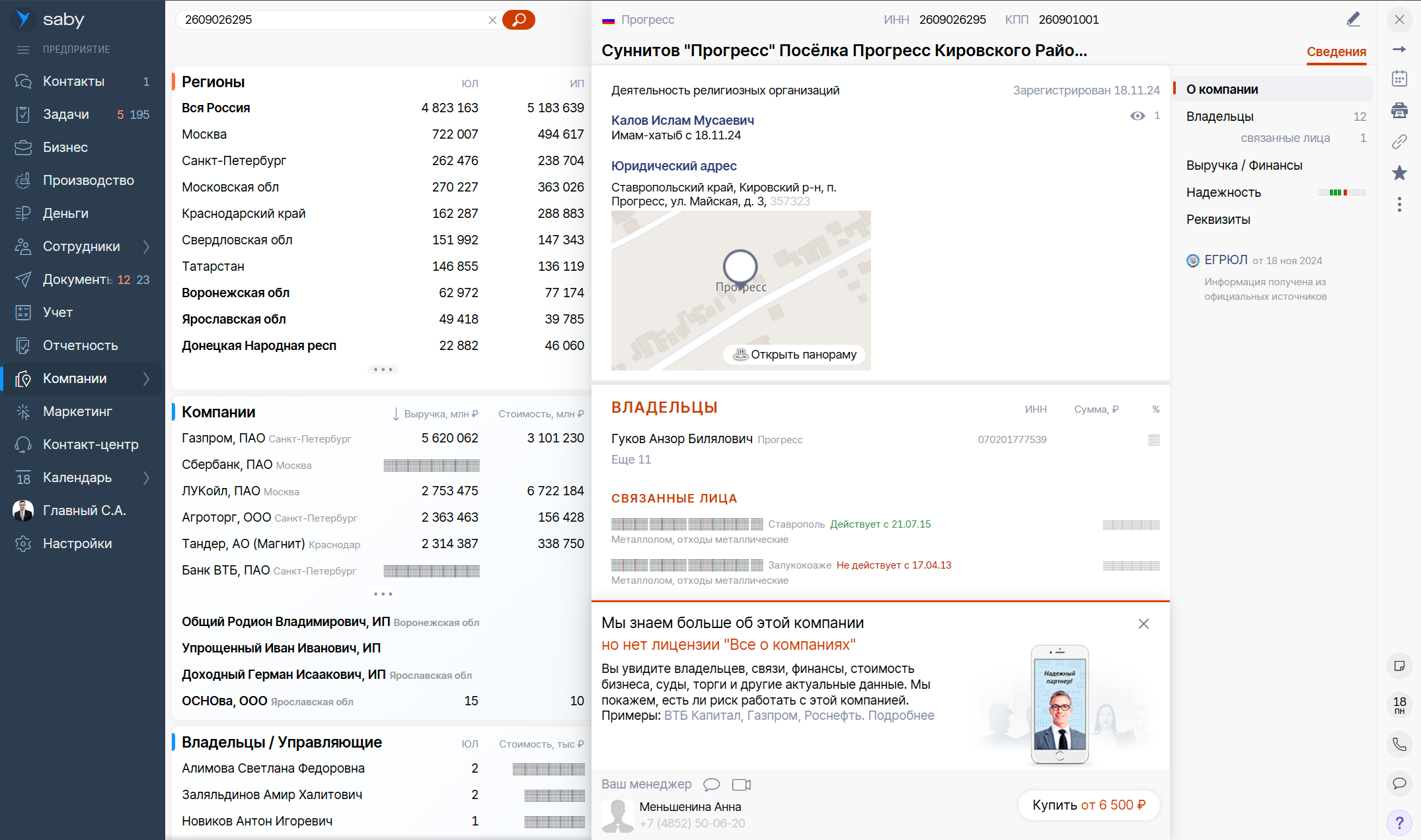 СБИС автоматически подгрузит и отобразит данные по введенному ИНН. В отчете можно найти информацию, которая включает: